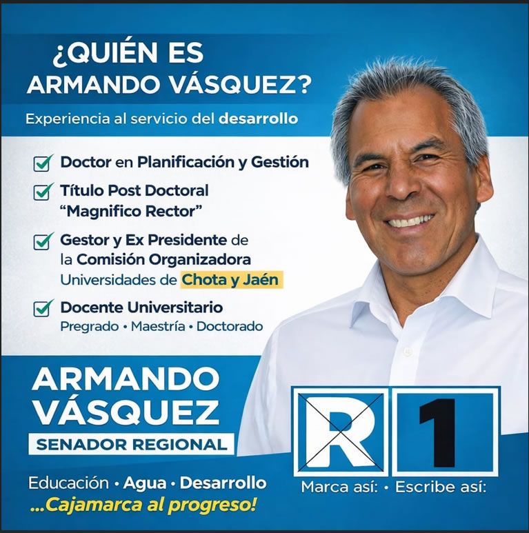 Armando Vásquez es un profesional con amplia experiencia en planificación, gestión y educación. Tiene grado de doctor, cuenta con un título postdoctoral como “Magnífico Rector” y ha sido gestor y expresidente de la comisión organizadora de universidades en Chota y Jaén. Además, es docente universitario en distintos niveles (pregrado, maestría y doctorado).